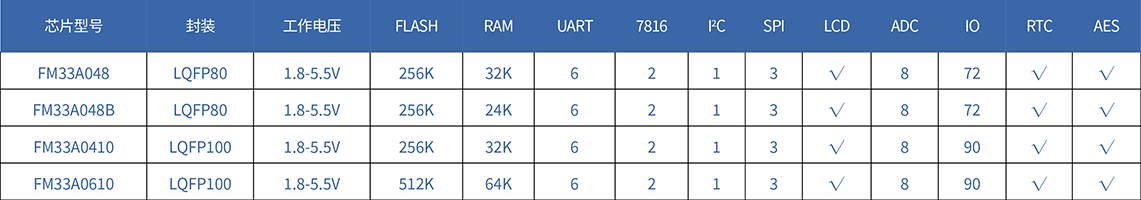 上海復旦微電子集團股份有限公司智能電表MCU包括32位Cortex-M0內核FM33A0xx/FM33A0xxB系列芯片及16位增強型8xC251內核FM33xx系列芯片。最大支持512KB FLASH程序存儲器和 64KB RAM,并集成LCD驅動、帶溫補的RTC、ADC、AES以及UART、I2C、SPI、7816等通用外設接口。